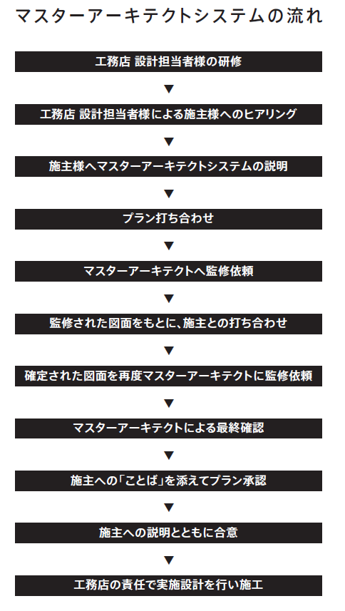 松岡をはじめ松岡と志を共にするマスターアーキテクトたちがマスターコンセプトの考え方をもとに工務店の設計者の基本設計に監修を行うことで、これまでは工務店の設計者のテクニックのみで対応していた顧客の囲い込みをマスターアーキテクトとともに二人三脚で行い施主に高いご満足をご提供することを可能にします。